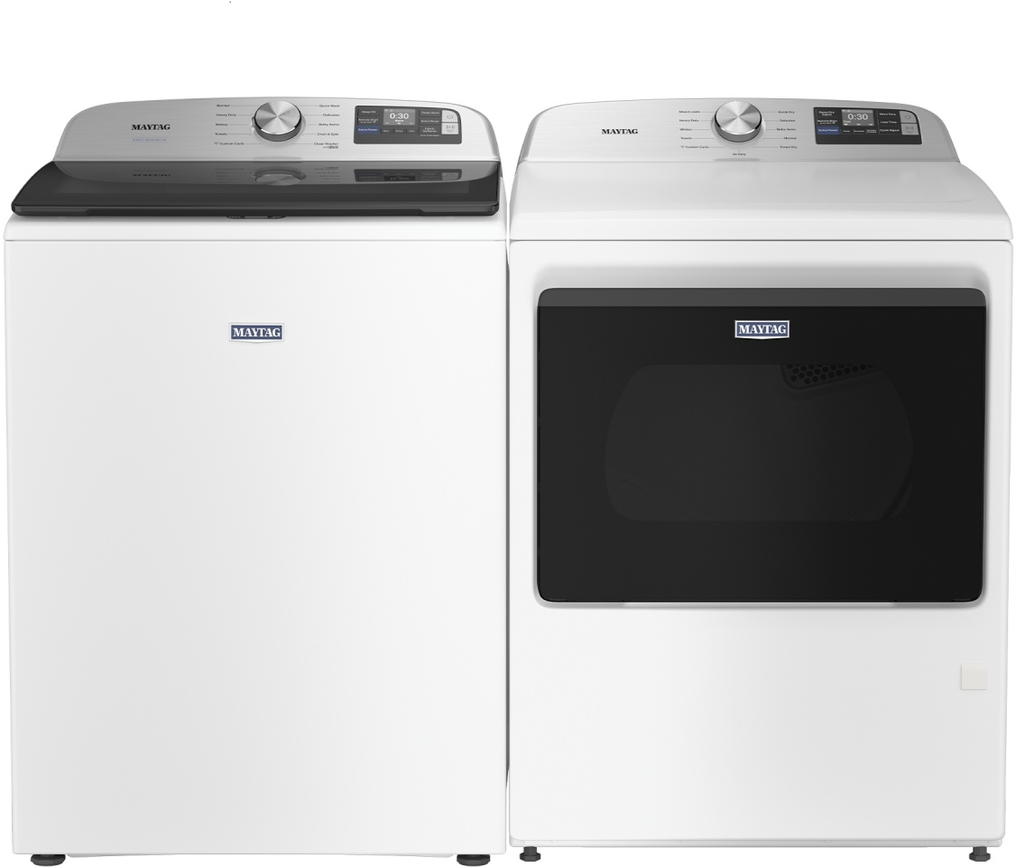 Maytag® White Laundry Pair with 5.2 Cu. Ft. Capacity top load washer and 7.4 Cu. Ft. Capacity front load electric dryer with extra power.Read More