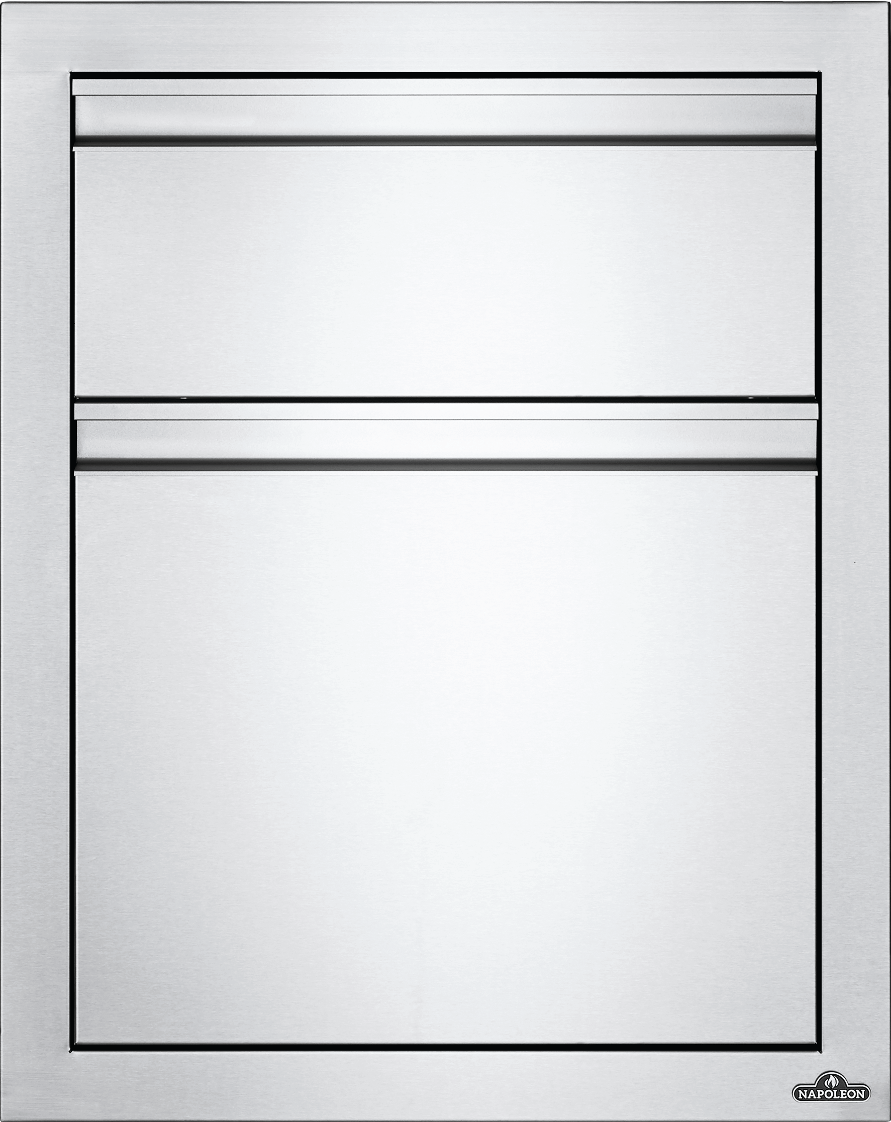Creating your own custom grill island has never been easier with Napoleon's Built-In Components. Every great outdoor kitchen needs storage; this double drawer cabinet features waste and recycling bins that can double as storage as well as a paper towel pull out. Stainless steel construction, soft closing hardware, seamless trim, and anodized aluminum handles provide durability and endless installation possibilities.Read More