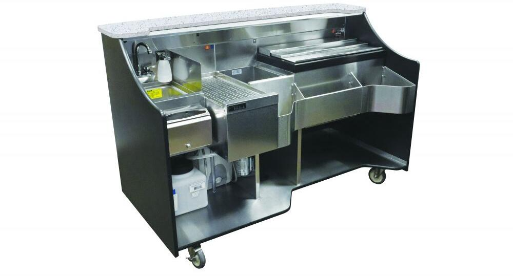 One drainboard, insulated bottle well, insulated ice chest, bottle rail, hand wash sink, water pump, hot water heater
