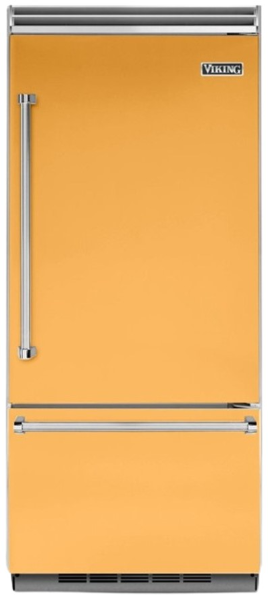 The Viking® 5 Series 36 in. 20.4 Cu. Ft. Daffodil Built-In Right Hinge Bottom Freezer Refrigerator features advanced cooling technology and precise temperature control. It offers a spacious interior for organized storage and a bottom freezer design for easy access to frozen foods, enhancing kitchen functionality and convenience.Read More